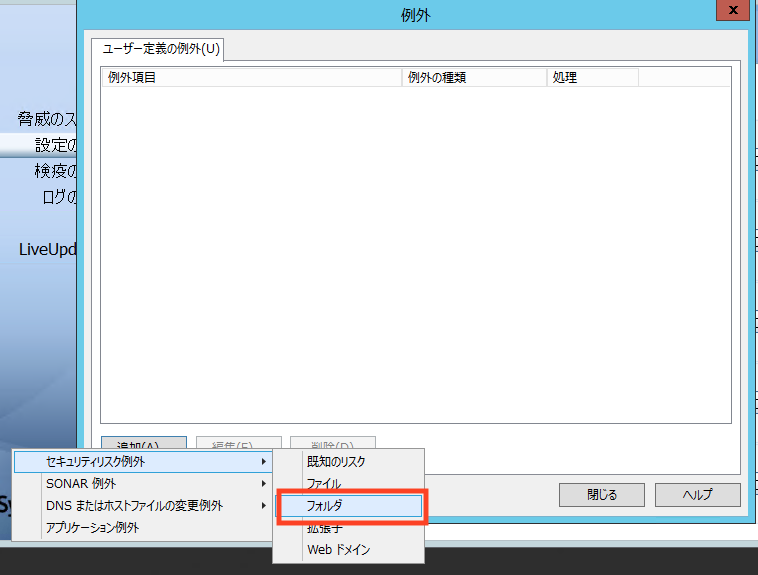 (3)例外ダイアログが表示されたら、「追加(A)...」ボタンをクリックして、セキュリティリスク例外->フォルダを選択します。