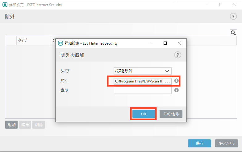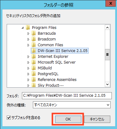 (4)「追加」ボタンをクリックして、「除外の追加」ダイアログからDW-Scan のインストールフォルダを指定します。タイプは「パスを除外」を指定します。