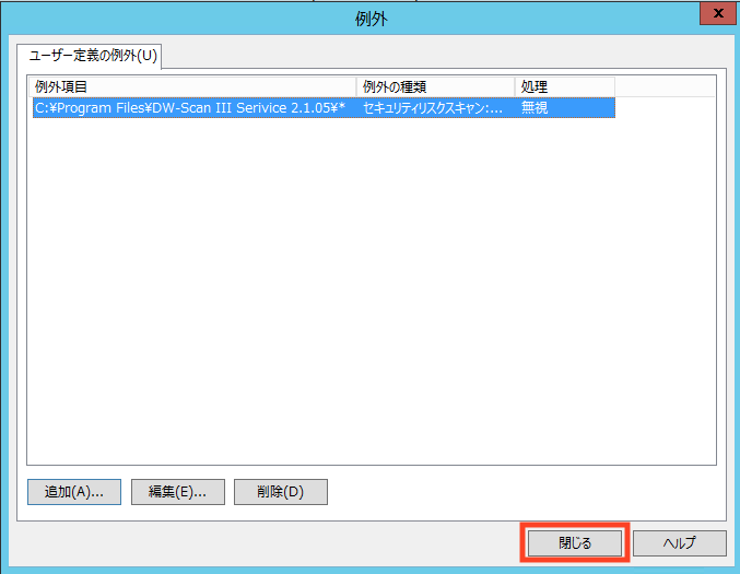 (5)除外指定が追加されたことを確認し、「閉じる」ボタンをクリックします。