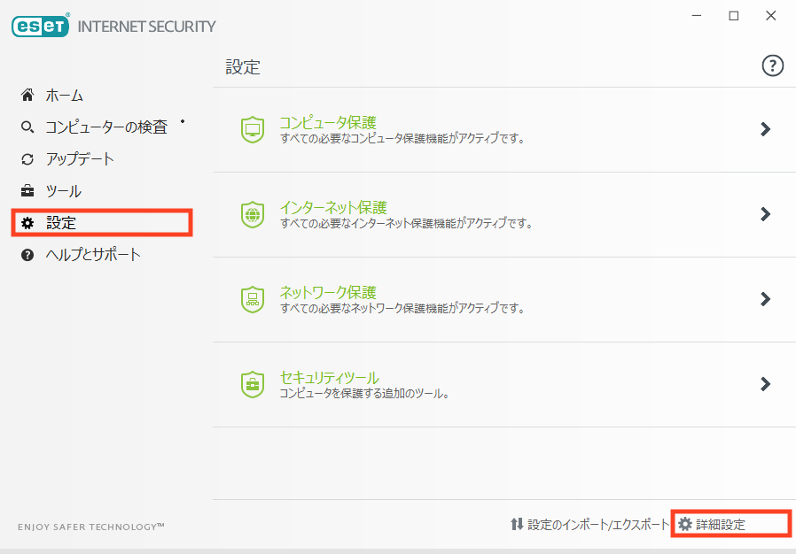 (2)左メニュー項目の「設定」をクリックして、ダイアログ右下の「詳細設定」ボタンをクリックします。
