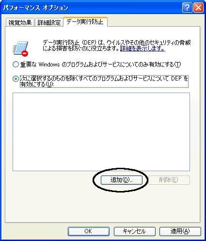 | [パフォーマンスオプション]ダイアログの[データ実行防止]タブを開き、