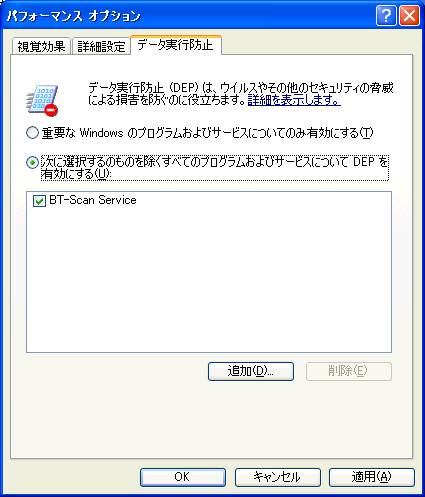 この設定は、Windowsのプログラムおよびサービス以外をDEP機能の対象外としますので、BT-ScanV5.1も対象外になります。 |