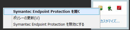 (1)タスクトレイのSymantec End Pointアイコンを右クリックして「Symantec End Point Protectionを開く」を選択します。