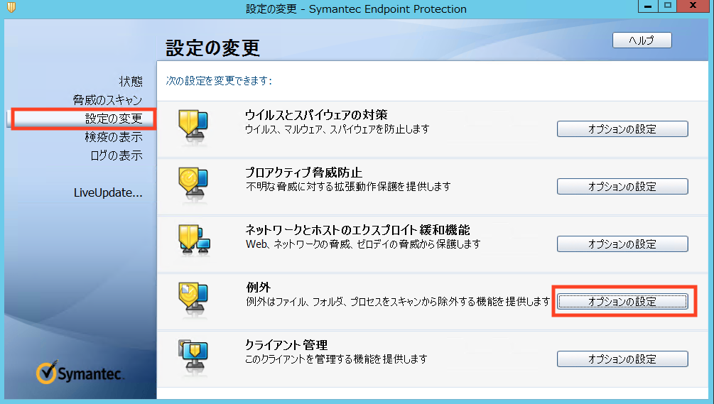 (2)左メニュー項目の「設定の変更」をクリックして、例外欄の「オプションの設定」ボタンをクリックします。