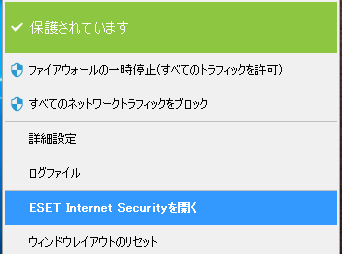 (1)タスクトレイのESETアイコンを右クリックして「ESET Internet Securityを開く」を選択します。